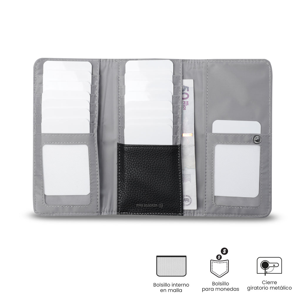 ¡Perfecta para acompañar cada momento! La billetera para mujer Smooth Sub grande de tres cuerpos incluye cierre giratorio metálico, bolsillo para monedas, manija fija, múltiples compartimentos internos y sistema anticlonación RFID Blocker. Su forro RPET aporta valor sostenible, mientras el exterior en poliuretano ofrece estética, comodidad y ligereza. El logo en placa metálica resalta su diseño.