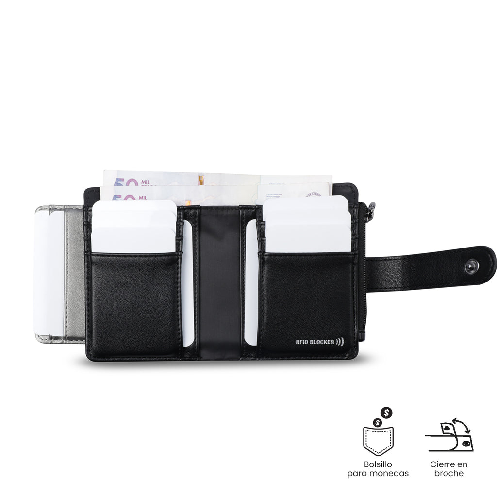 ¡Ideal para quienes prefieren lo práctico sin perder diseño! La billetera para mujer Style Dull pequeña de dos cuerpos ofrece cierre en broche, bolsillo para monedas, porta documentos extraíble y sistema RFID Blocker. Su forro RPET, hecho con material reciclado, combina con un exterior en poliuretano suave y ligero. El logo en clissé le da un toque distintivo. Especificaciones |