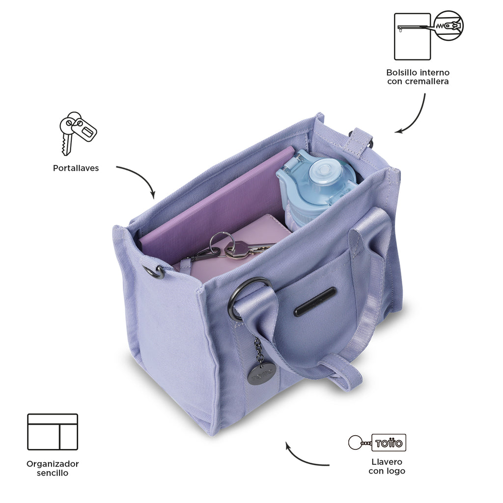 ¡Lleva lo esencial con estilo! El bolso Tote-Bag tipo crossbody está confeccionado en algodón y poliéster, con un diseño práctico. Incluye un organizador sencillo, bolsillo interno con cremallera, porta llaves y un bolsillo posterior plano para acceso rápido. Además, tiene una correa removible y viene con un llavero metálico tipo moneda con logo. ¡Ideal para tu día a día! Especificaciones |