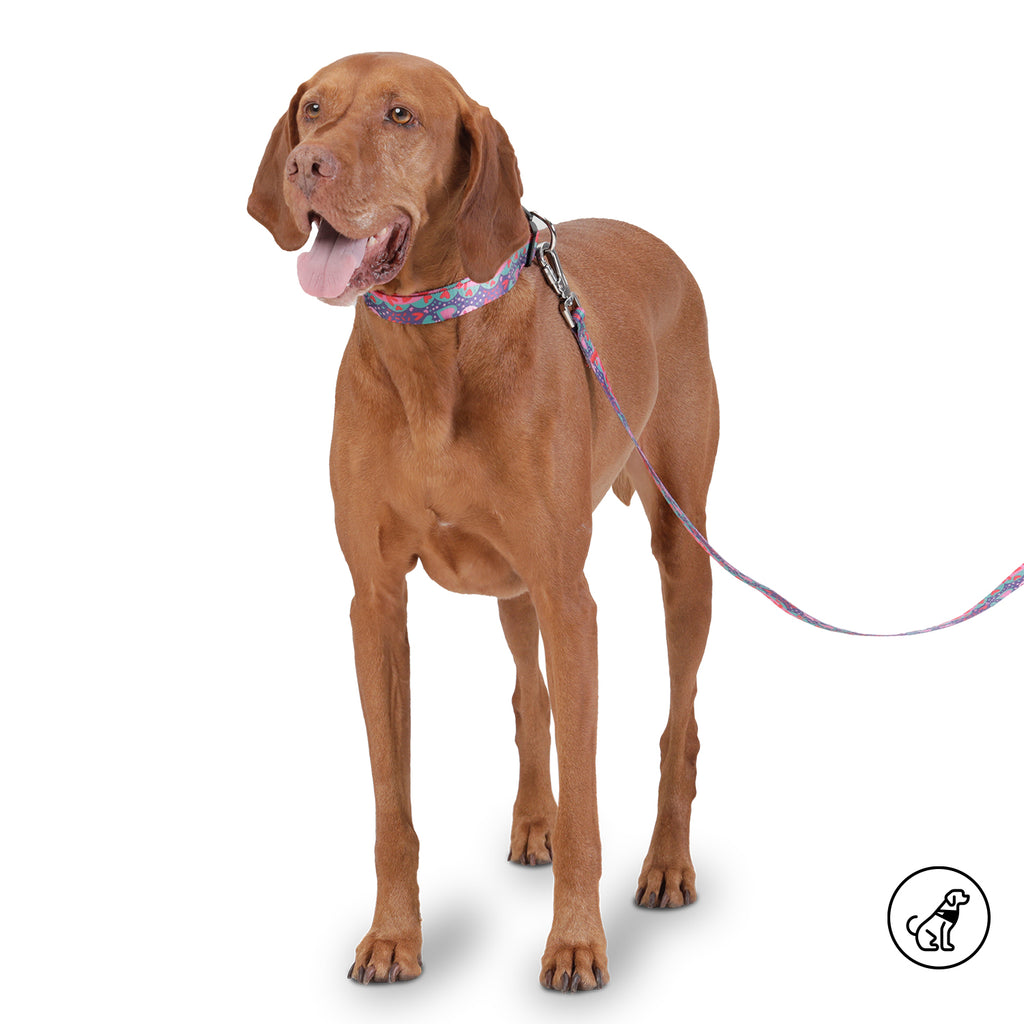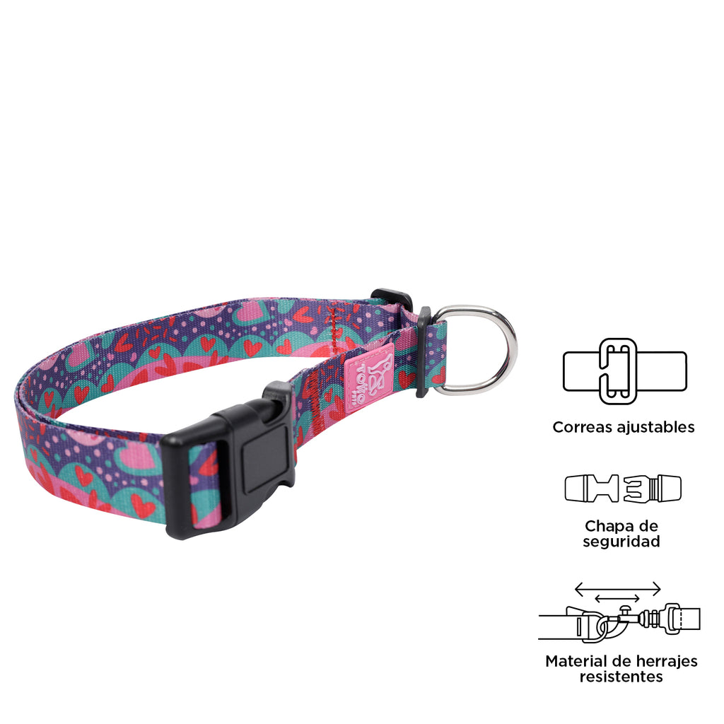 ¿A dónde vamos hoy? Este collar ajustable es fabricado con un material muy resistente pensado en la fuerza que puede generar tu mascota, por lo que es totalmente seguro y confiable a la hora de pasear. Cuenta con una chapa de seguridad y un anillo para colocar la placa de tu peludo. Viene en diferentes colores, 5 tallas y en 3 anchos de correa según el tamaño de tu mascota