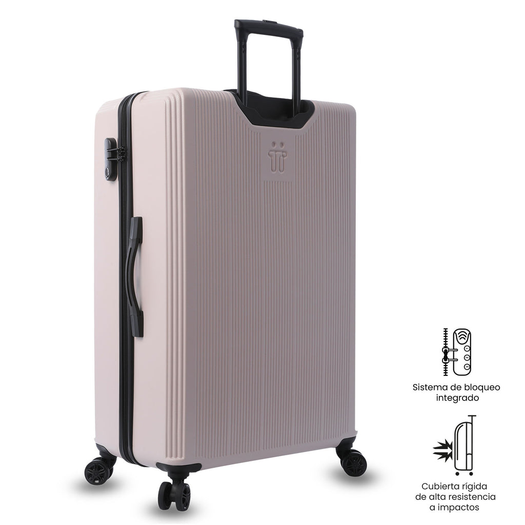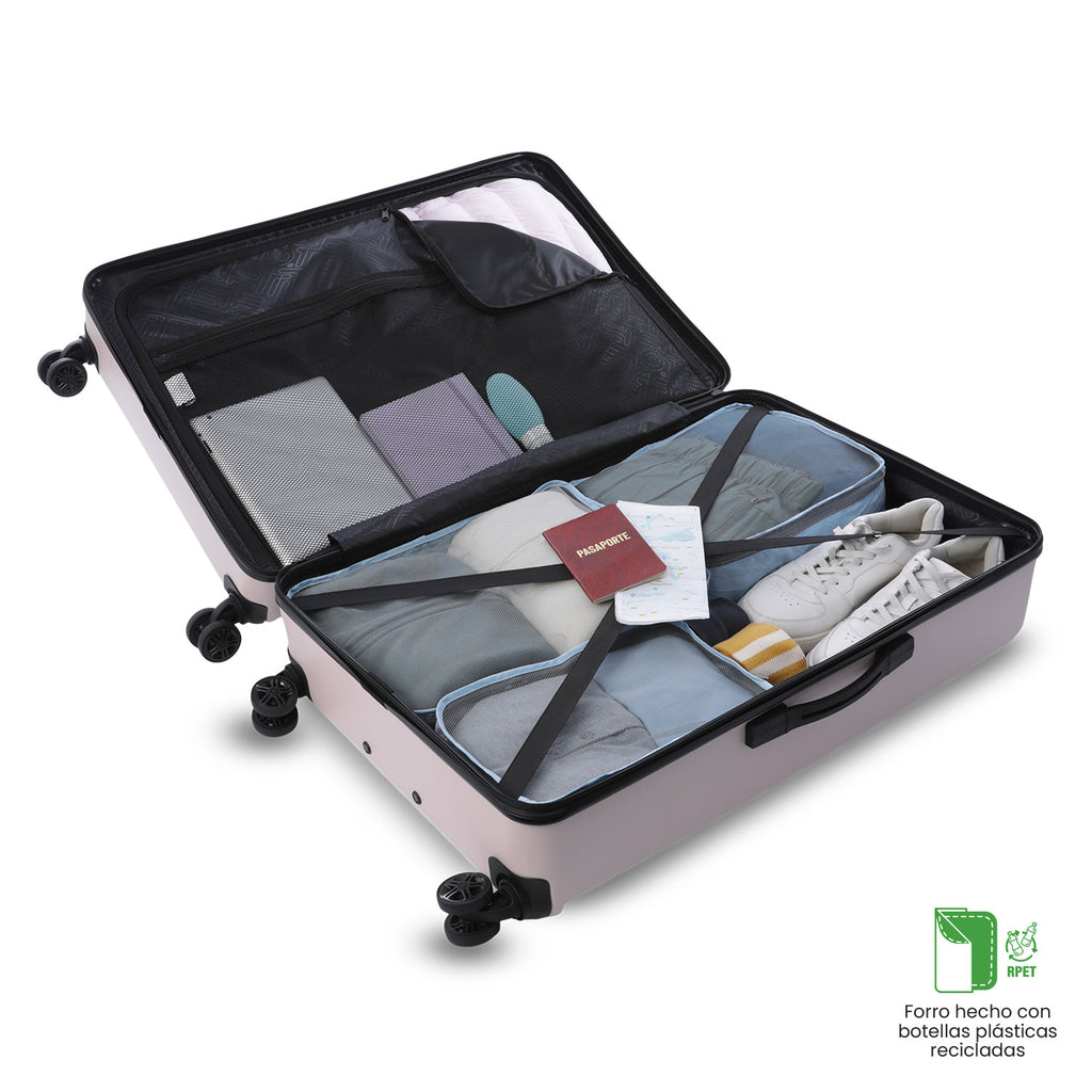 ¡Hazla tuya ahora! La maleta de viaje 360 Sko grande es ideal para viajes largos, con 115,3L de capacidad. Su sistema de ruedas dobles 360° facilita su desplazamiento, mientras que el material ABS + policarbonato mix le otorga alta resistencia a impactos. Con candado tres dígitos, telescopio ajustable y compartimentos internos con tapa en malla, es perfecta para viajeros exigentes. Forro RPET para mayor sostenibilidad.