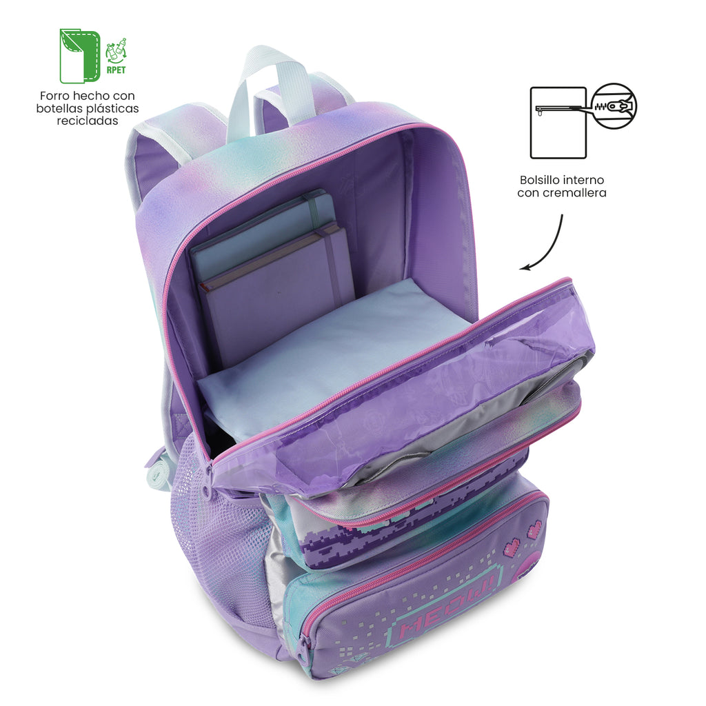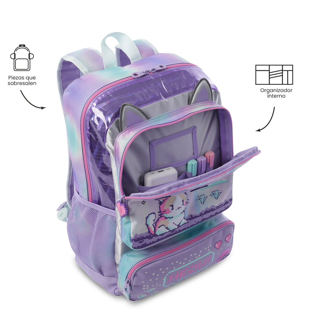 ¡Haz que cada trayecto escolar sea inolvidable! La mochila para niña Andy Cat grande tiene compartimiento principal con doble cremallera, dos bolsillos frontales con cierre, bolsillos laterales porta botellas, manija superior y correas acolchadas ajustables. Confeccionada en poliéster y forrada en RPET reciclado, incluye llavero interactivo en goma en forma de garra y parches intercambiables.