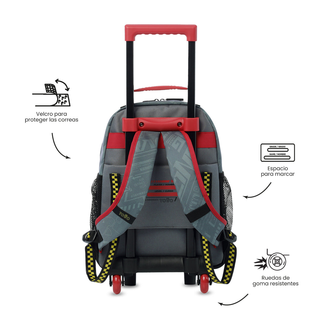 ¡Llena de diversión a tu pequeño con el morral con ruedas Grand Prix! Confeccionado en poliéster y forro RPET, tiene un compartimento principal con doble cremallera y bolsillos laterales portabotellas. Su llamativo estampado en alta densidad de pista de carreras y el llavero interactivo en goma lo hacen único. Sus correas acolchadas ajustables y la comodidad del diseño lo convierten en la opción perfecta para el día a día escolar. ¡Solo para ti! Especificaciones |