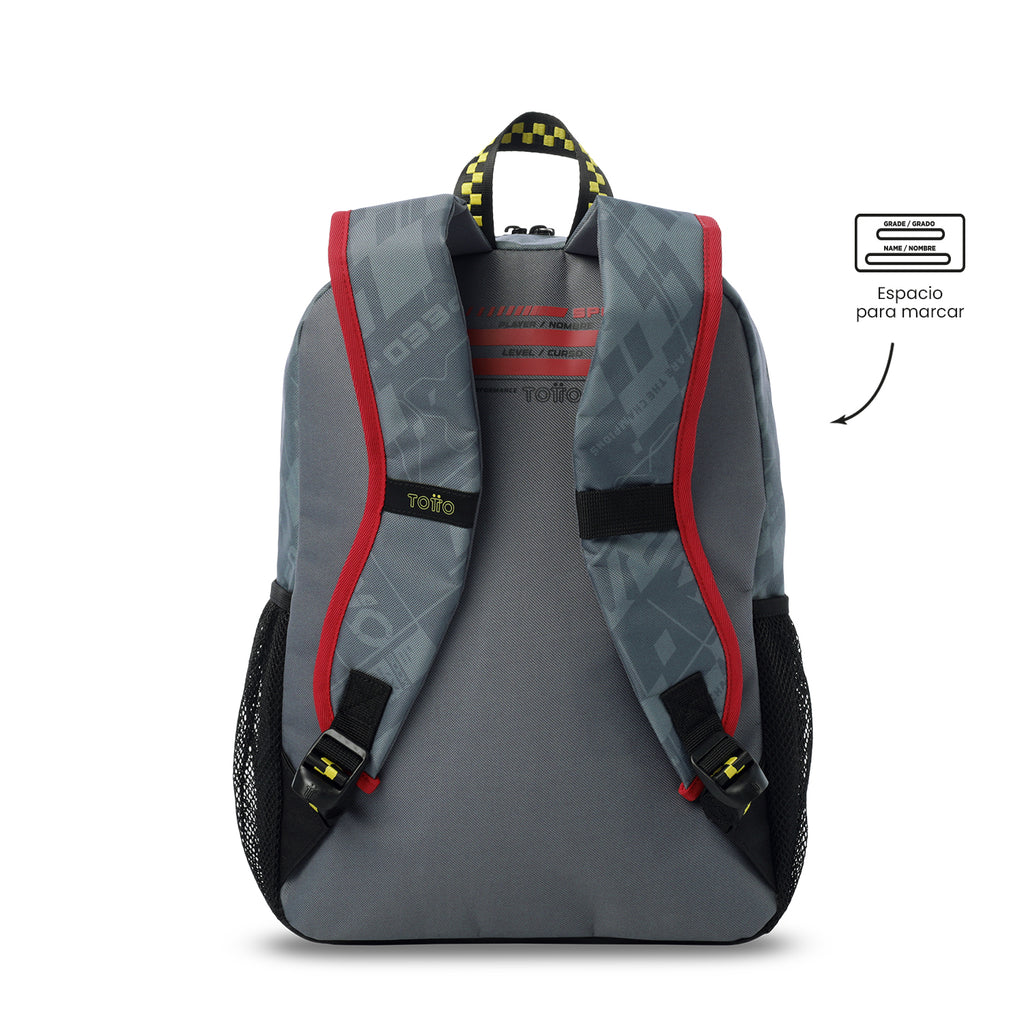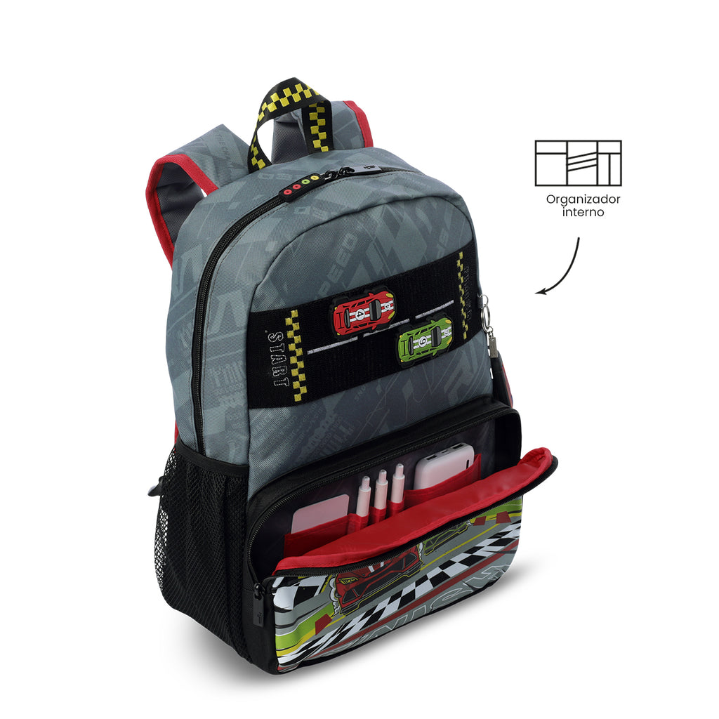 ¡Convierte cada día escolar en una carrera hacia la meta! La mochila para niño Grand Prix mediano destaca por su frente estampado en alta densidad con temática de autos de competición, pines decorativos y parches intercambiables. Cuenta con compartimiento principal de doble cremallera, organizador interno, bolsillos laterales porta botellas, correas acolchadas y manija superior. Incluye un llavero de auto en goma. ¡Una mochila lista para ganar! Especificaciones |