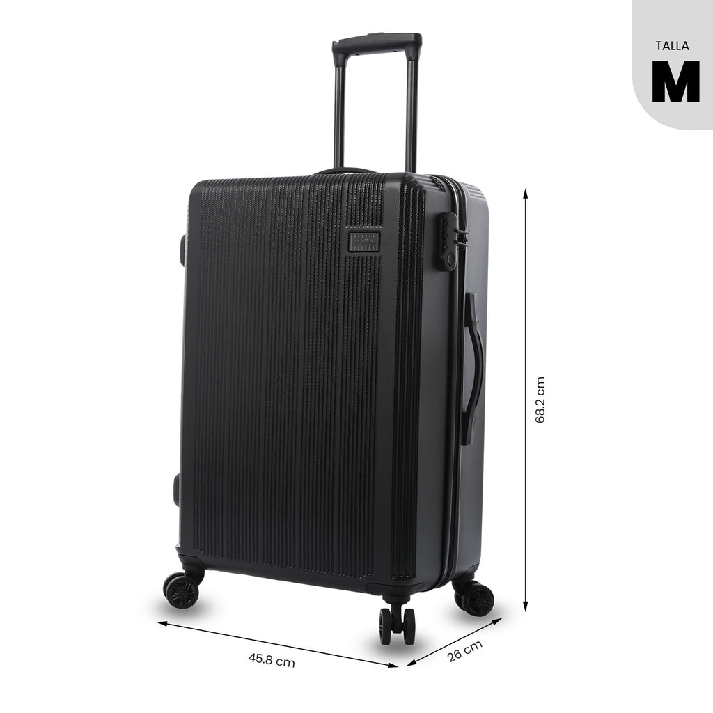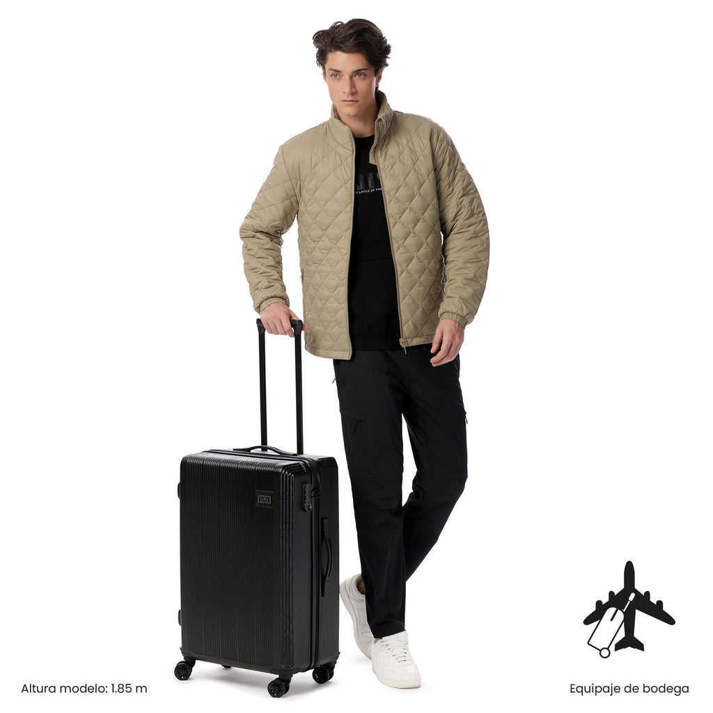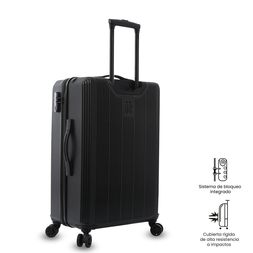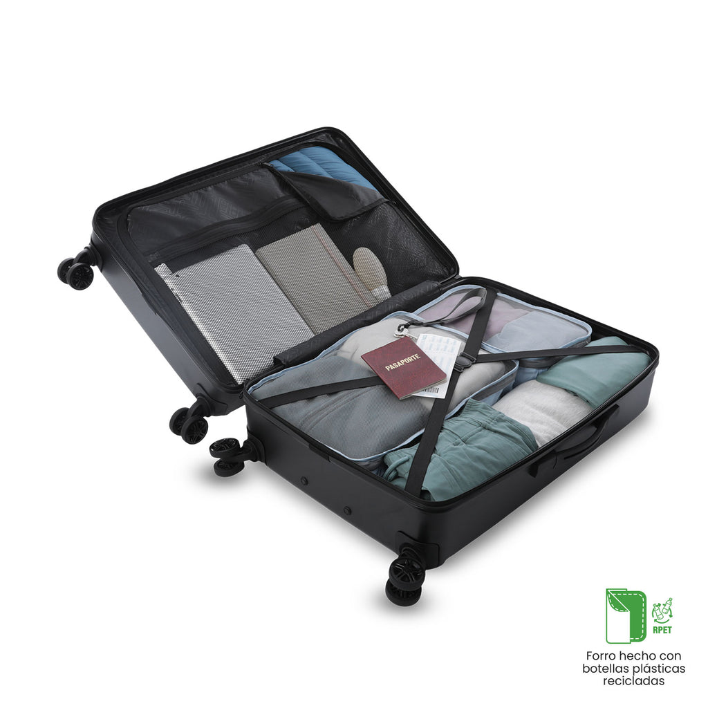La maleta mediana 360 Sko es ideal para viajes largos, con 74L de capacidad y 4 ruedas dobles 360° que facilitan su desplazamiento. Fabricada con material ABS + policarbonato mix, es resistente a impactos, y cuenta con un sistema telescópico ajustable y candado de tres dígitos para mayor seguridad. Su interior tiene tapa en malla y correas de ajuste, además de forro RPET.