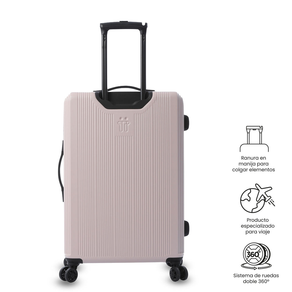 La maleta mediana 360 Sko es ideal para viajes largos, con 74L de capacidad y 4 ruedas dobles 360° que facilitan su desplazamiento. Fabricada con material ABS + policarbonato mix, es resistente a impactos, y cuenta con un sistema telescópico ajustable y candado de tres dígitos para mayor seguridad. Su interior tiene tapa en malla y correas de ajuste, además de forro RPET.