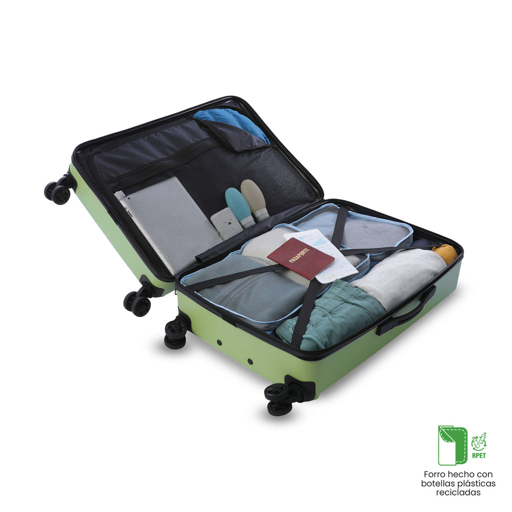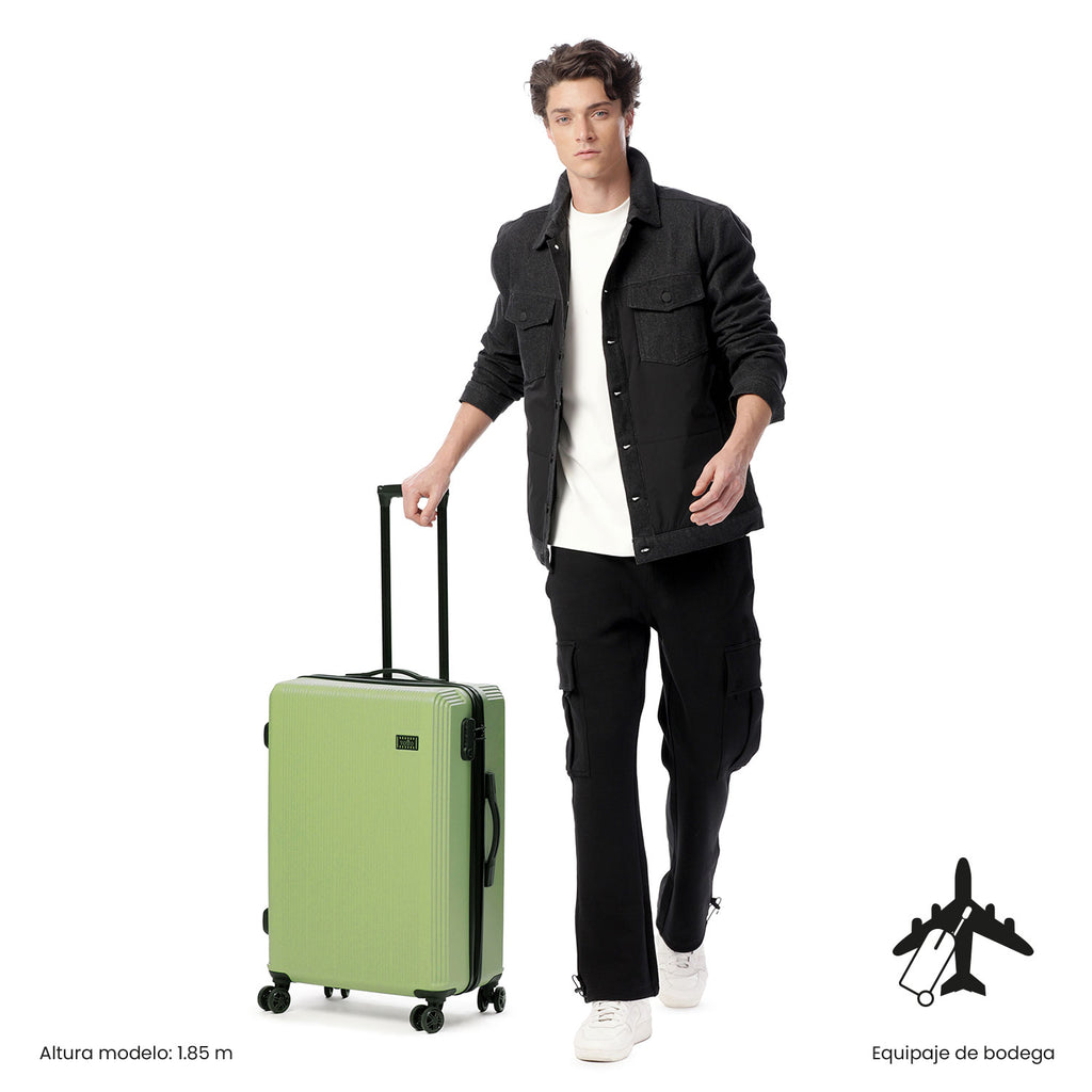 La maleta mediana 360 Sko es ideal para viajes largos, con 74L de capacidad y 4 ruedas dobles 360° que facilitan su desplazamiento. Fabricada con material ABS + policarbonato mix, es resistente a impactos, y cuenta con un sistema telescópico ajustable y candado de tres dígitos para mayor seguridad. Su interior tiene tapa en malla y correas de ajuste, además de forro RPET. Especificaciones |