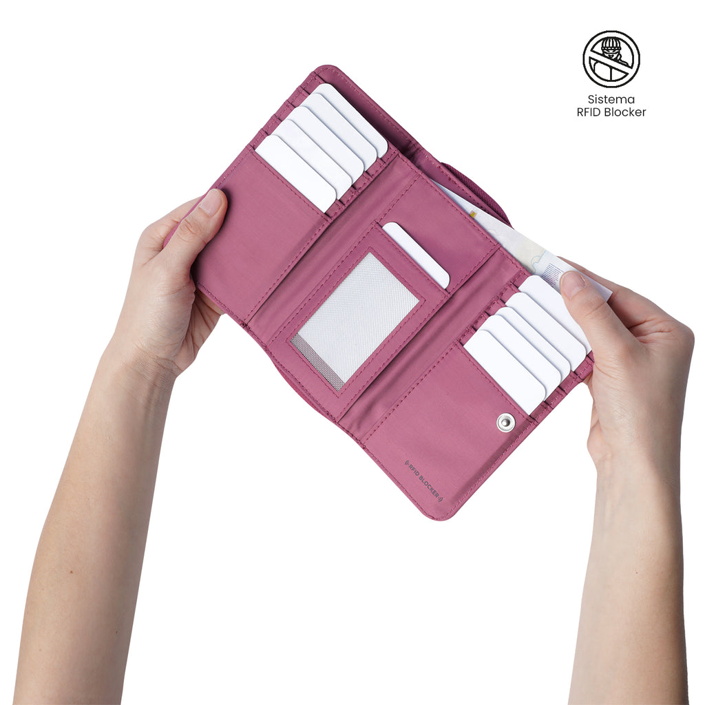 Haz que tus documentos estén siempre seguros con esta billetera para mujer práctica y funcional. Su estructura de tres cuerpos incluye compartimentos para tarjetas, billetes y monedas, además de un práctico bolsillo interno en malla. Gracias a su sistema RFID Blocker, protege tus datos frente a posibles capturas de información. Su material es resistente, ligero y de secado rápido, ideal para el uso diario. ¡Llévala ahora!