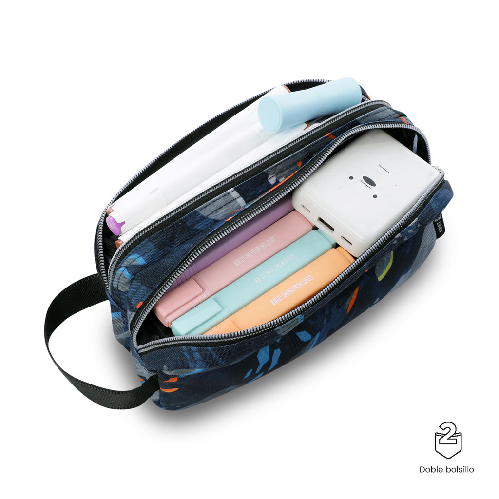 La cartuchera multiuso grande Escuadra es un accesorio imprescindible para las personas que buscan funcionalidad y sostenibilidad. Fabricada con botellas plásticas recicladas RPET, es repelente a líquidos, tiene doble bolsillo para mayor organización y una manija fija para fácil transporte. El logo bordado agrega un toque distintivo y moderno. ¡Añádela a tu colección y lleva tus objetos esenciales de manera práctica!