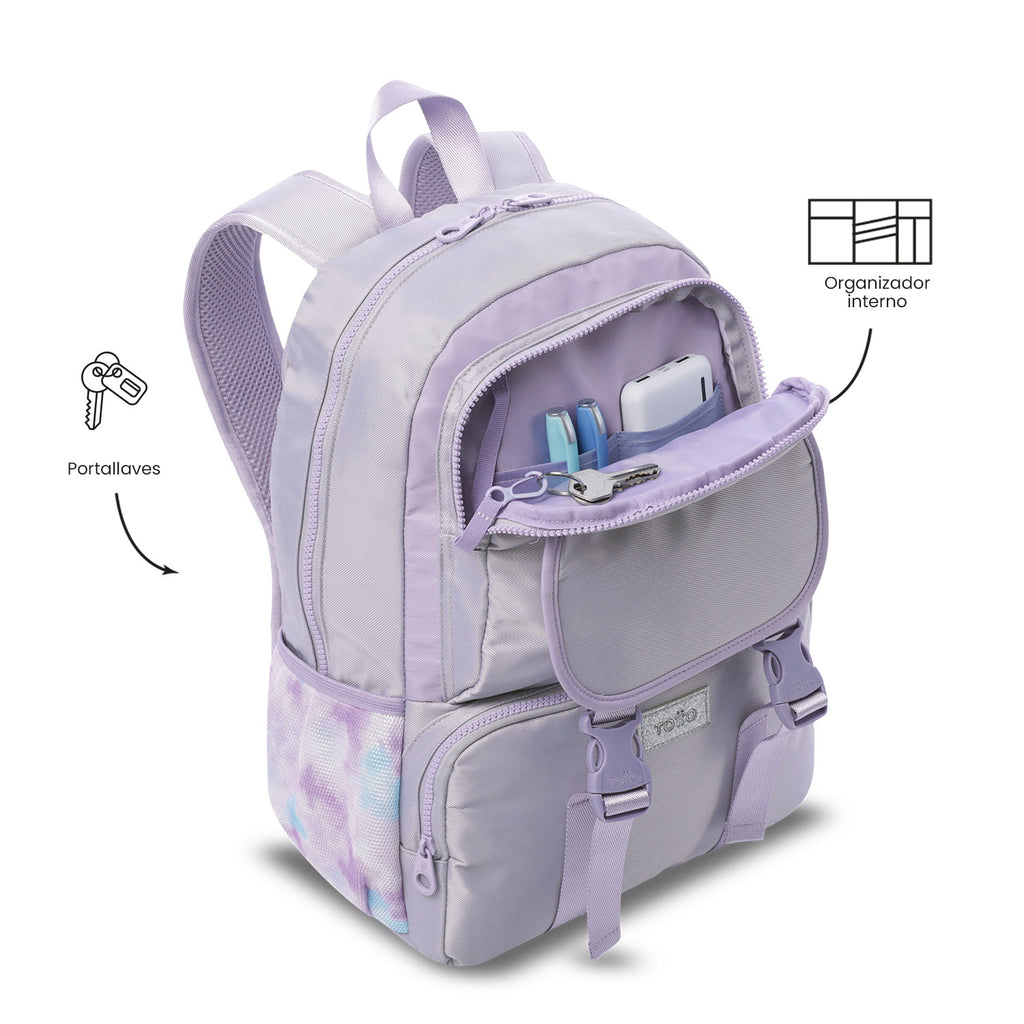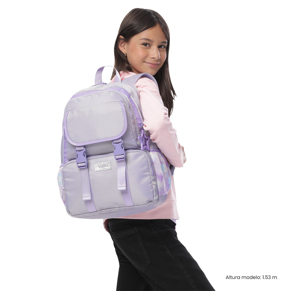 ¡Comodidad en tus clases La maleta para el colegio Cluw es ideal para llevar todo con facilidad. Su compartimento principal con doble cremallera permite un almacenamiento seguro, mientras que los bolsillos frontales y laterales brindan mayor practicidad. Fabricada en poliéster Twill, es resistente y ligera. Sus correas acolchadas ajustables garantizan un ajuste cómodo. Además, incluye un llavero en forma de estrella. ¡Brilla ahora!