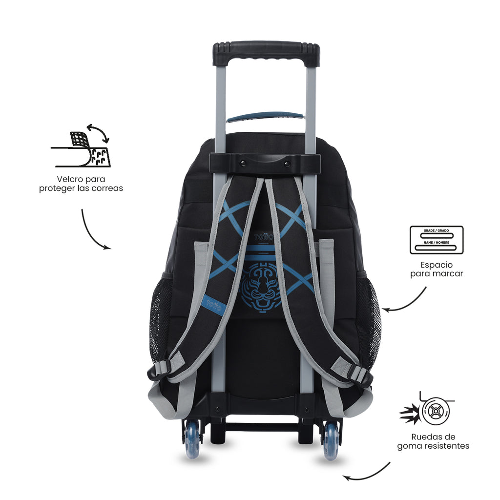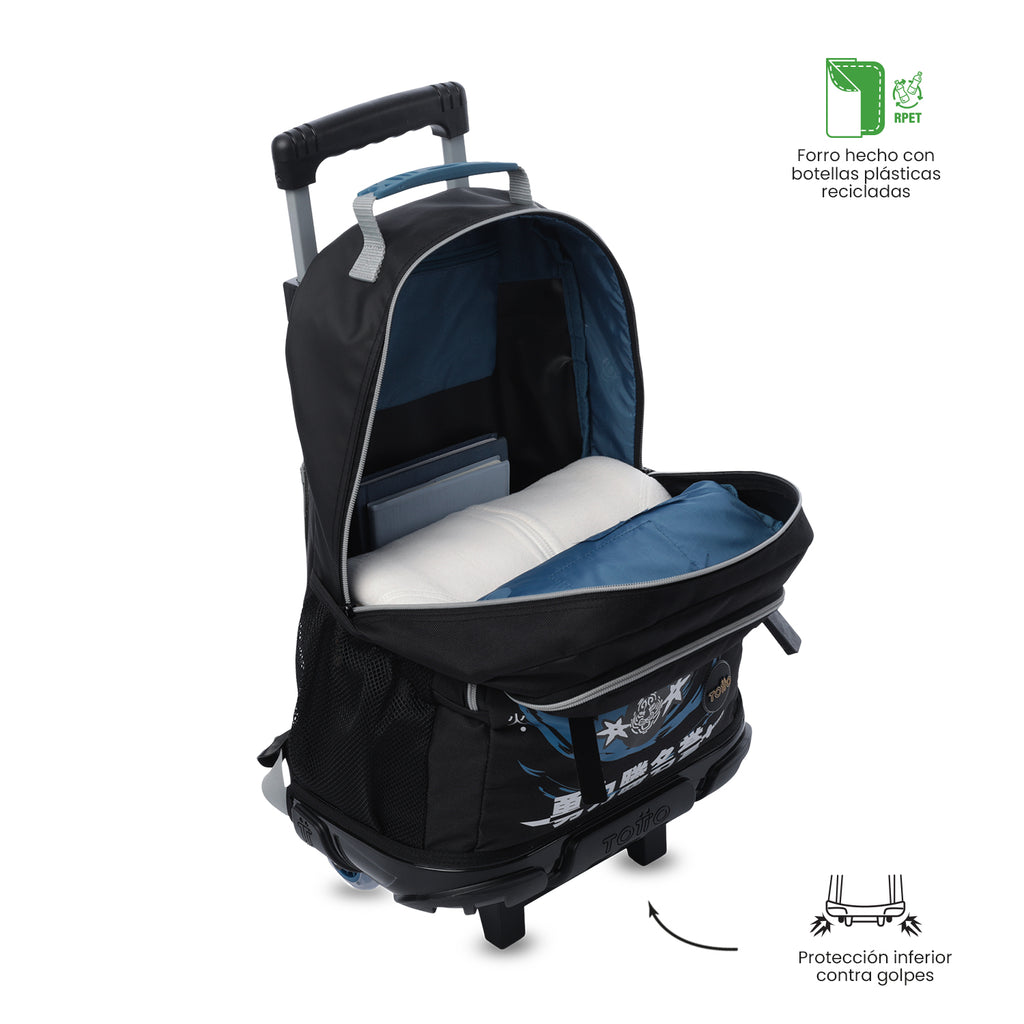 ¡Aventura y estilo en el colegio! La maleta de ruedas infantil Hanzo grande está confeccionada en poliéster con forro RPET reciclado. Cuenta con compartimiento principal de doble cremallera, correas acolchadas ajustables y bolsillos laterales para botellas. Su llamativo diseño en alta densidad presenta un ninja en acción y viene con llavero en goma del personaje protagonista, haciendo del morral un accesorio único y divertido. ¡Clases más divertidas! Especificaciones |