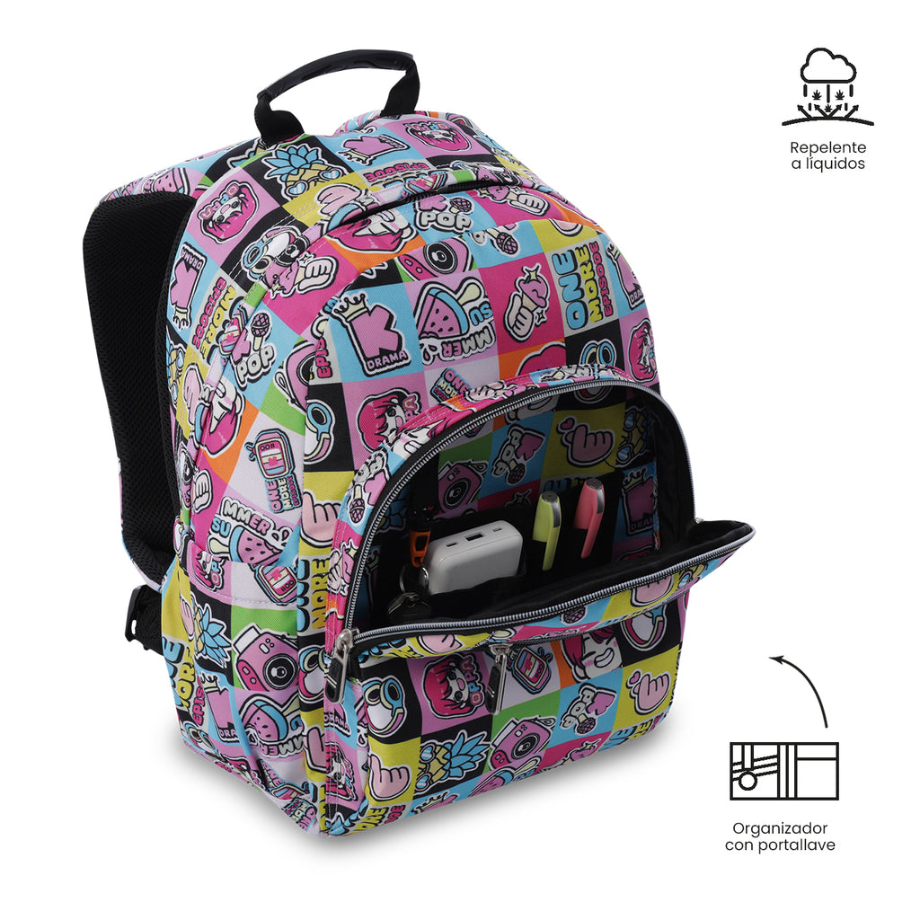 ¡Lleva tus útiles escolares con comodidad! El morral Gommas mediano está elaborado en lona RPET reciclada de 9 botellas plásticas, incluye organizador con portallaves, bolsillos laterales para botella o sombrilla, bolsillo en malla con elástico en correa para carnet, dos bolsillos frontales de acceso rápido, espaldar y correas ergonómicas con air mesh, llavero en goma con forma de luchador y manija de goma. ¡Llévalo al colegio!