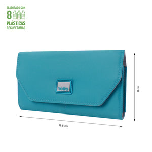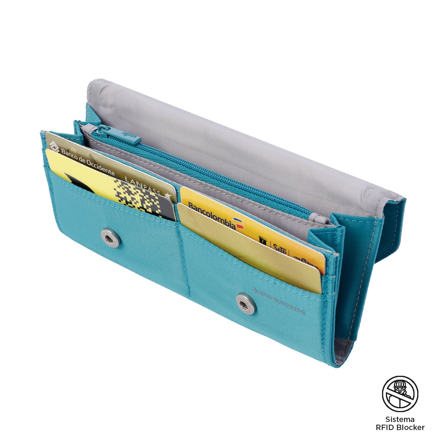 Billetera elaborada en lona ECO. Este accesorio está hecho con RPET, un material reciclado de botellas plásticas. Incluye monedero en la parte interna; con cierre en cremallera, un organizador para billetes, dos organizadores para tarjetas. Su cierre es en broche y su marquilla es micro inyectada. Además, incluye sistema de RFID Blocker, para evitar la clonación de tarjetas.