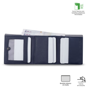 ¡Sorpréndelo con un regalo práctico, moderno y seguro! La billetera para hombre Saffiano Aqi Totto de tres cuerpos es perfecta para el día a día: cuenta con RFID Blocker que protege tu información y evita clonaciones, cierre en broche, forro RPET reciclado, tarjetero, bolsillo en malla y espacio para billetes. Su tamaño pequeño facilita llevarla en el bolsillo sin perder organización.