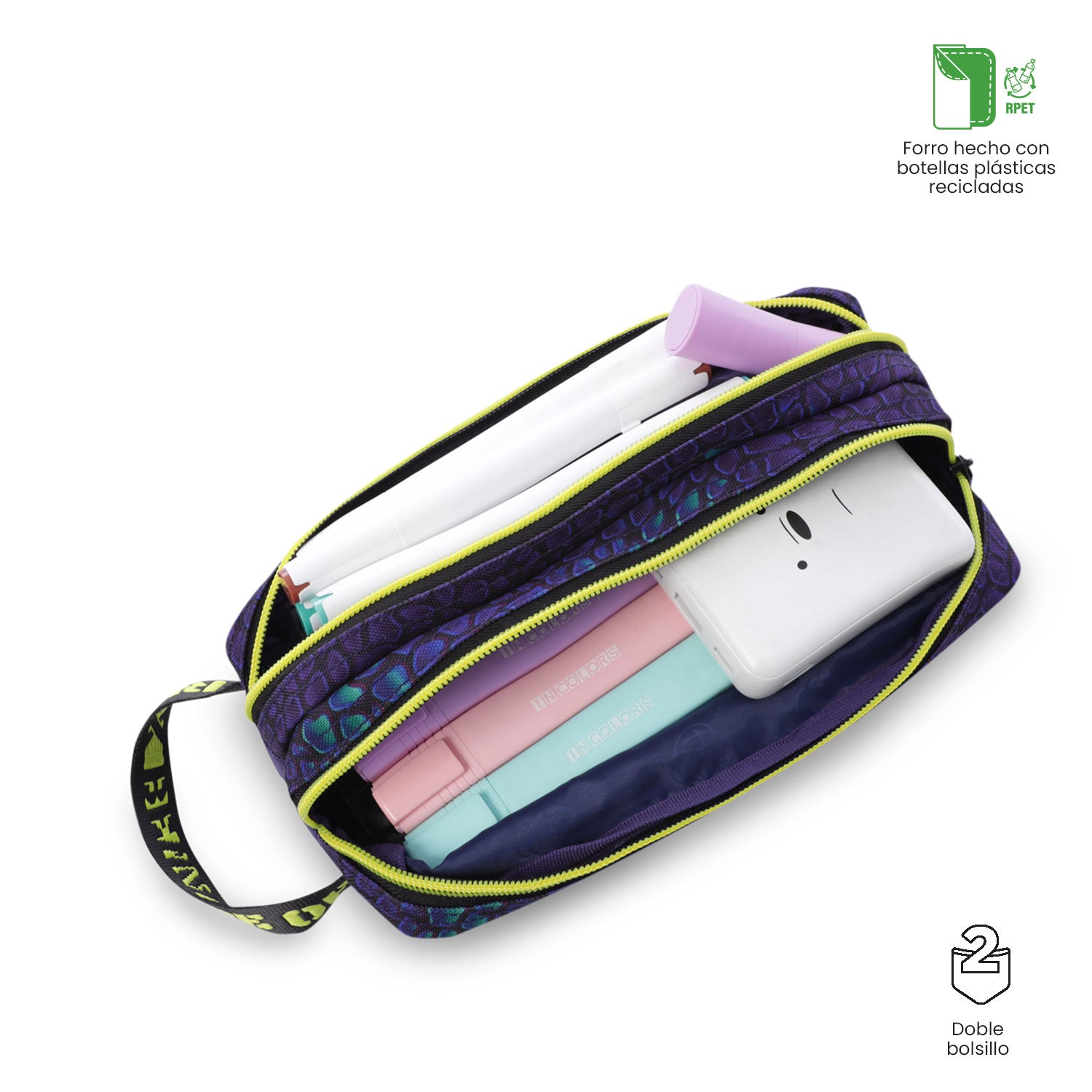 ¡La cartuchera Dino Rock convierte la organización en un juego! Este multiusos cuenta con dos compartimentos amplios y cierre seguro, tus lápices y colores siempre estarán a la mano. Su espacio posterior permite personalizarla con tu nombre, y la reata lateral facilita llevarla cómodamente. Además, su forro de RPET hecho con botellas recicladas la hace amigable con el planeta. Especificaciones |