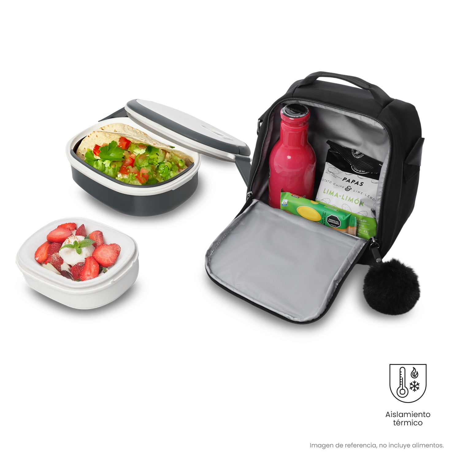 La lonchera Adelaide 2 es perfecta para llevar tus comidas de manera cómoda y segura. Este modelo compacto cuenta con tecnologÃa térmica que preserva la temperatura por hasta 5 horas. Cuenta con forro interno RPET, elástico portabotella y un atractivo pompón en la cremallera. Con su correa ajustable y removible, se adapta a tu rutina diaria. Especificaciones |