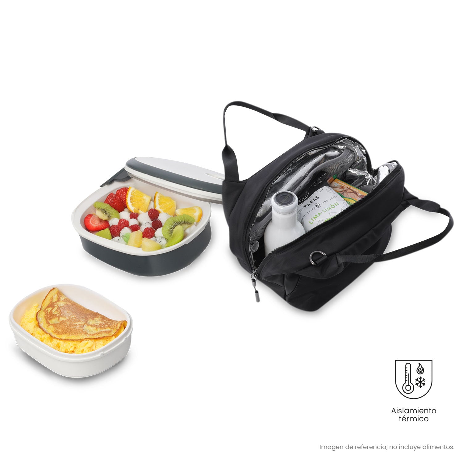 ¡Transporta tu comida con total funcionalidad gracias a la lonchera para almuerzo Roxanne! Su diseño grande incluye correa de hombro removible, elástico portabotella, bolsillo interno en malla y aislamiento térmico que conserva la temperatura hasta por 5 horas. Fabricada en materiales resistentes con detalles en poliuretano, es fácil de limpiar y contiene fibras recicladas. Su logo en placa metálica destaca en el diseño. ¡Disfruta de tus comidas en el lugar que prefieras! Especificaciones |