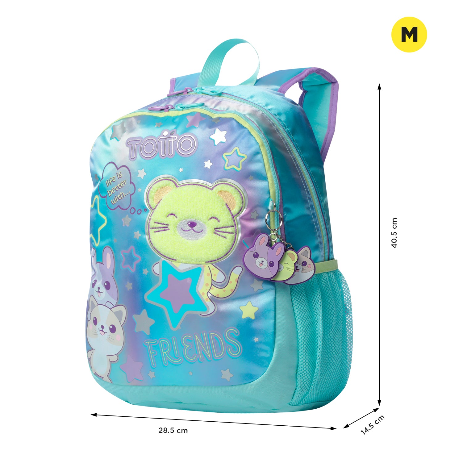 ¡Haz que cada día escolar sea especial con la maleta Friends M! Confeccionada en poliéster y equipada con un compartimento principal con cierre de doble cremallera. Sus correas acolchadas ajustables ofrecen comodidad, mientras que los bolsillos laterales y el bolsillo frontal con cremalleras te brindan practicidad. El encantador estampado en puff con escarcha y el llavero tipo pom pom añaden un toque único. ¡No te quedes sin la tuya!