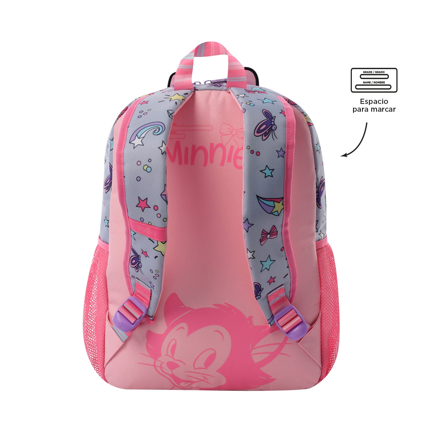 ¡Haz que el colegio sea mágico con la mochila Minnie S! Confeccionada en poliéster, presenta un estampado en alta densidad y un moño interactivo en la parte frontal. Su compartimiento principal con doble cremallera, correas acolchadas ajustables, manija superior y bolsillos laterales porta botellas aseguran comodidad y organización. Incluye un bolsillo frontal con cierre para objetos pequeños y un llavero de goma. ¡Adquiere esta maleta!