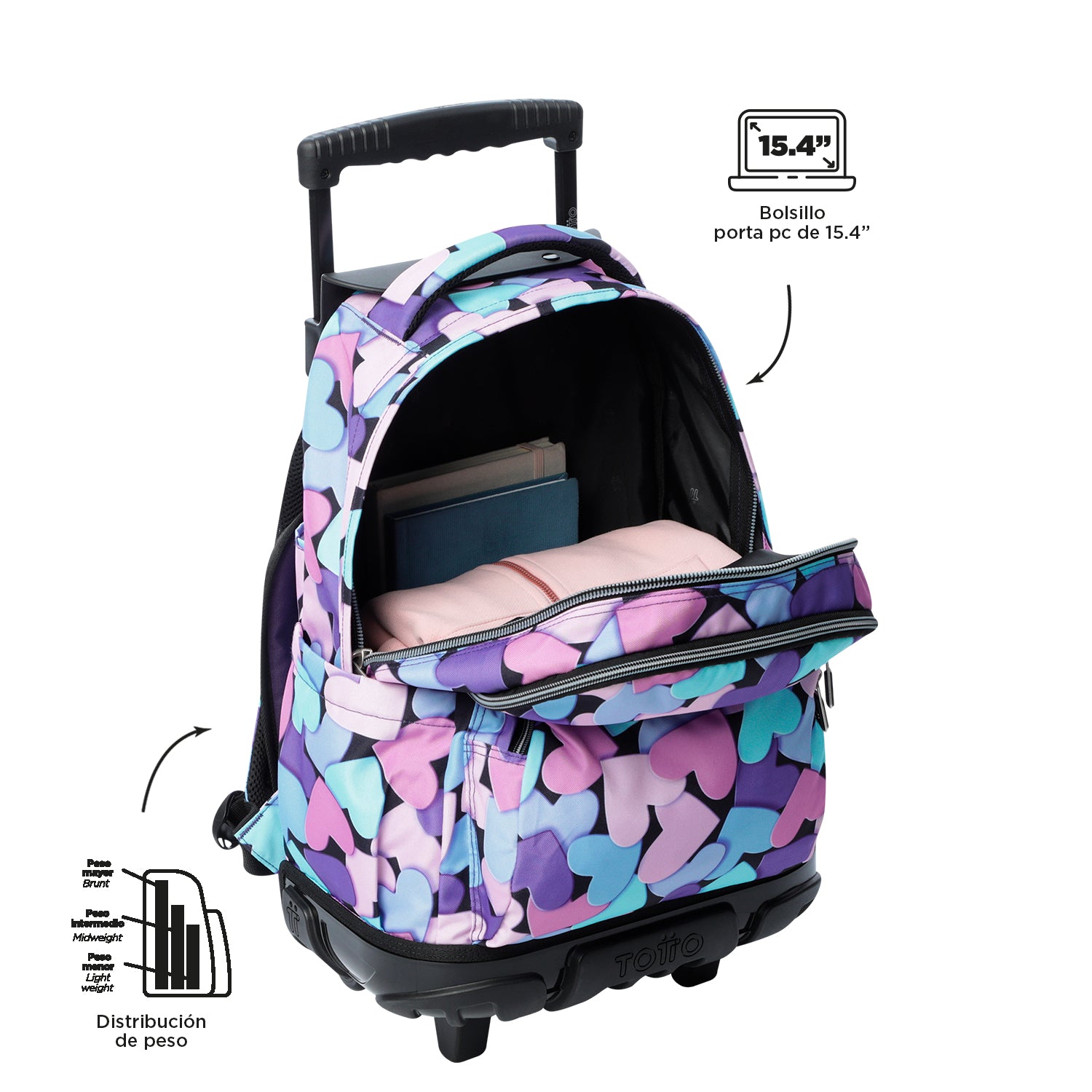 ¡Ofrece a tu pequeño, funcionalidad y resistencia con el Mochila con ruedas Renglon! Este modelo está fabricado con lona RPET a partir de 13 botellas recicladas. Incluye un organizador con portallaves, ruedas de goma de alta resistencia y bomper de protección contra impactos. Su manija telescópica y protector de correas ofrecen un uso práctico y seguro. ¡Cómpralo ya!