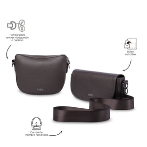 ¡Lleva todo con comodidad y estilo! El set de bolso Style es un diseño 3 en 1 que te permite usar dos piezas por separado gracias a su sistema de herrajes. Confeccionado en cuero sintético con acabados mate y metalizado, incluye un bolsillo interno plano, bolsillo posterior y correa de hombro satinada, removible y ajustable. Además, su forro RPET está hecho con botellas recicladas, aportando un toque ecológico a tu look. ¡Práctico y moderno!